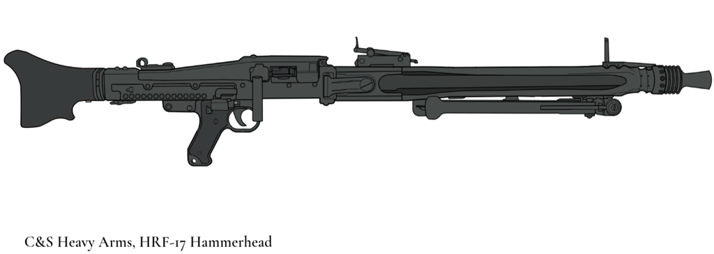 The lightest crew served weapon is the 7.62x51mm COMBINE HRFM-17B "Hammerhead", it is the Ground Forces standard Medium Machine Gun, it's older sibling, the 7.62x51mm COMBINE HRF-14 "Tigershark" is also used but is being phased out. The 12.7x99mm COMBINE HRF-19 "Great White" heavy machine gun and is generally used as the go to vehicle-mounted machine gun but can also be used as a static weapon. In the same way, the 40mm HGL-10 "Monarch" grenade machine gun is also used.