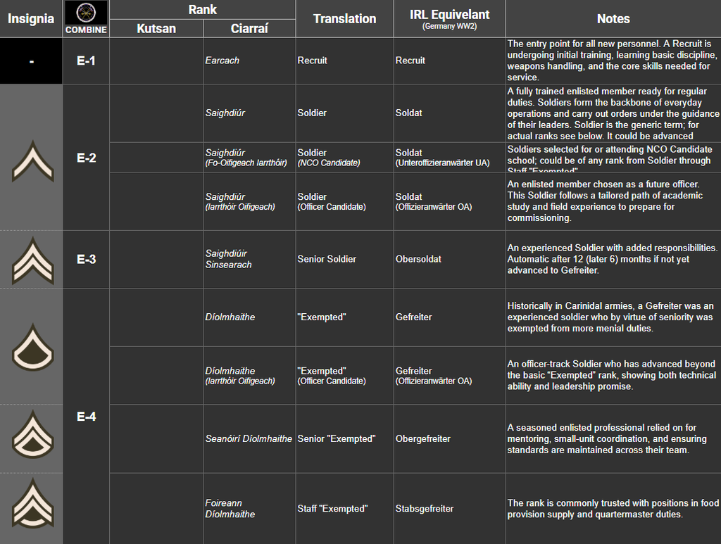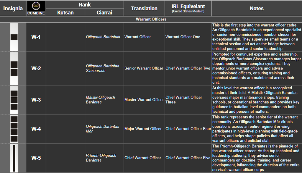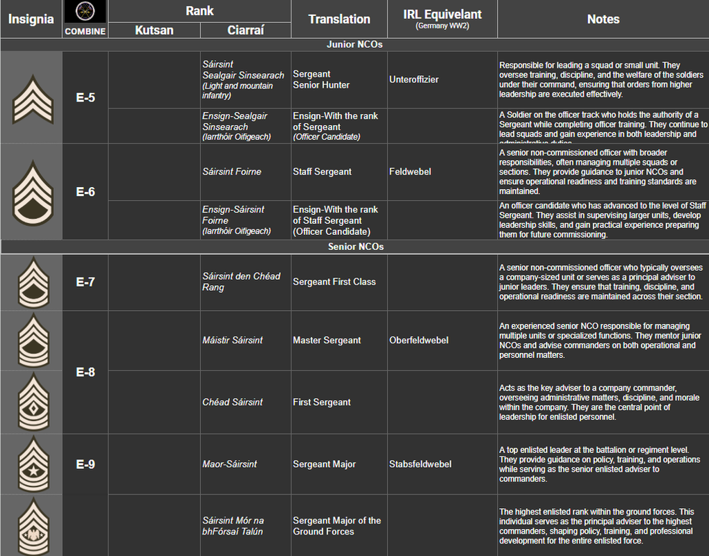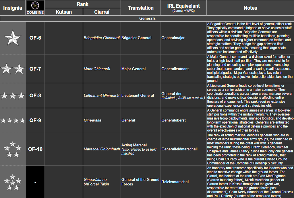 1st Army Ranger Wing ![]() | MacEoghann Military Base, Téachsaís | Commonly referred to as "Na Fianna", "Na Fíochsidhe", "The Warriors" and "The Rangers", ARW-1 is the CGF's Tier 1 Special Mission Unit tasked with performing the most complex, classified, and dangerous missions directed by the National Command Authority. Under the control of Joint Special Operations Command, ARW-1 specializes in hostage rescue, counter-terrorism, direct action, and special reconnaissance against high-value targets via eight squadrons: four assault, one aviation, one clandestine, one combat support and one CBRN. |