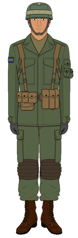 The main Battle Dress Uniform (BDU) of the Ground Forces is the Blarney BDU, it consists of mostly of an olive drab green and comes with the standard webbing in the same colour. Special uniforms like the tan Arid BDU and white Snow BDUs Troops are also issued but are only given in the case that troops are operating in that environment for an extended period of time. Also issued are the M10 Steel Helmet with a covers and standard ruck and bergen packs.